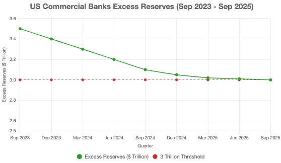 One thing we can watch is the reserve balances held by commercial banks, also known as the "excess reserves" maintained by the Federal Reserve. As of September 24, 2025, the total excess reserves in the banking system were $2,999.7 billion. This is the second time in the past two years that the level of excess reserves in the commercial banking system has fallen below $3.0 trillion.
