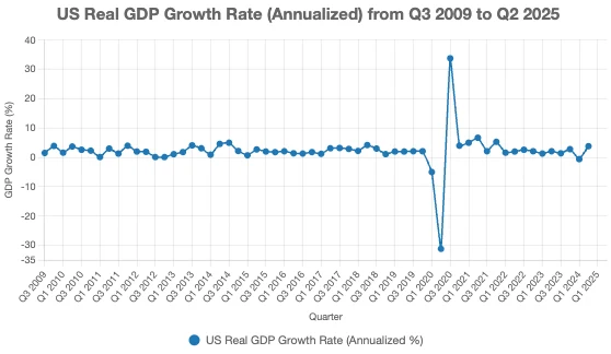It's worth noting that the U.S. economy grew at a compound annual rate of 2.4% from the third quarter of 2009 to the second quarter of 2025. Policymakers would like the U.S. economy to grow at a higher rate than that, but Mr. Powell and the Fed seem satisfied with what they have achieved so far...relatively stable growth, relatively low inflation, and relatively low unemployment. Furthermore, they are pleased with the fact that they have experienced only one very brief recession during this period.