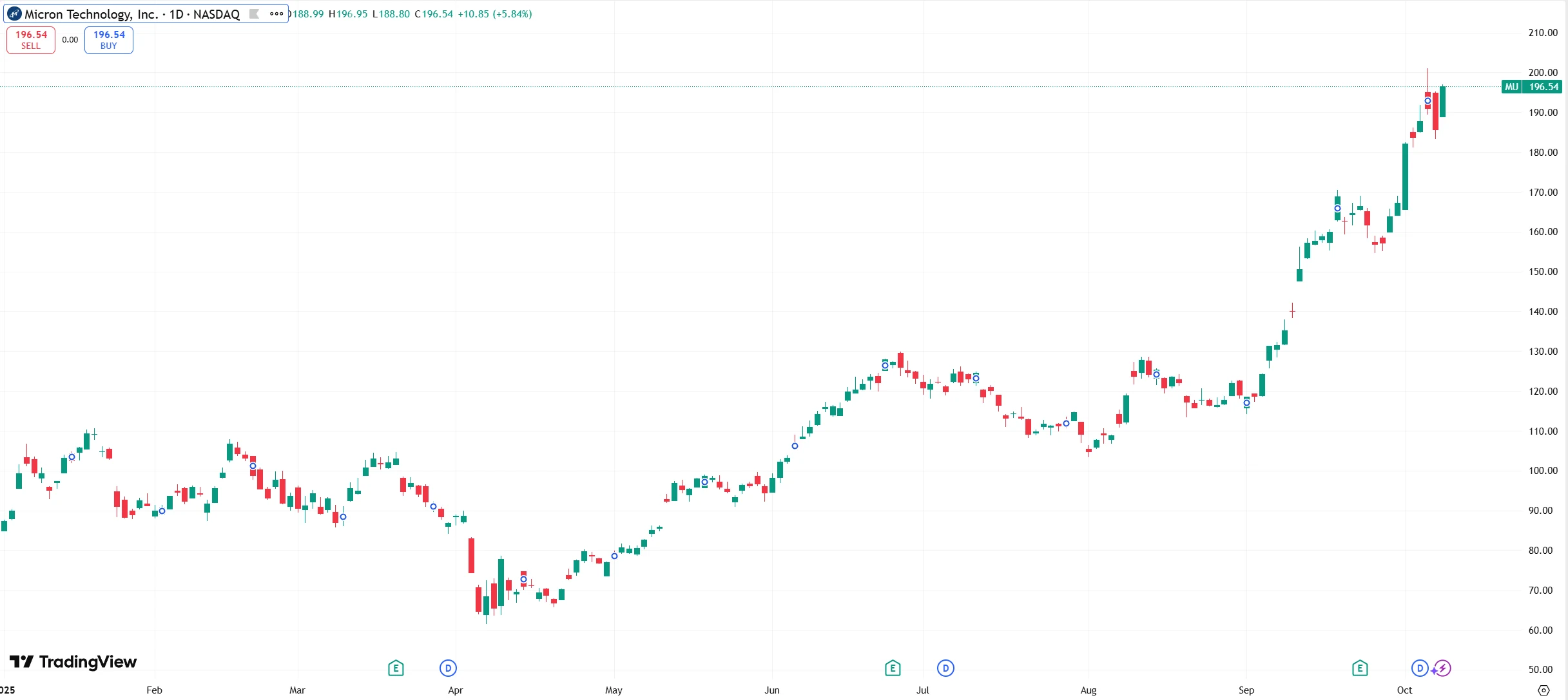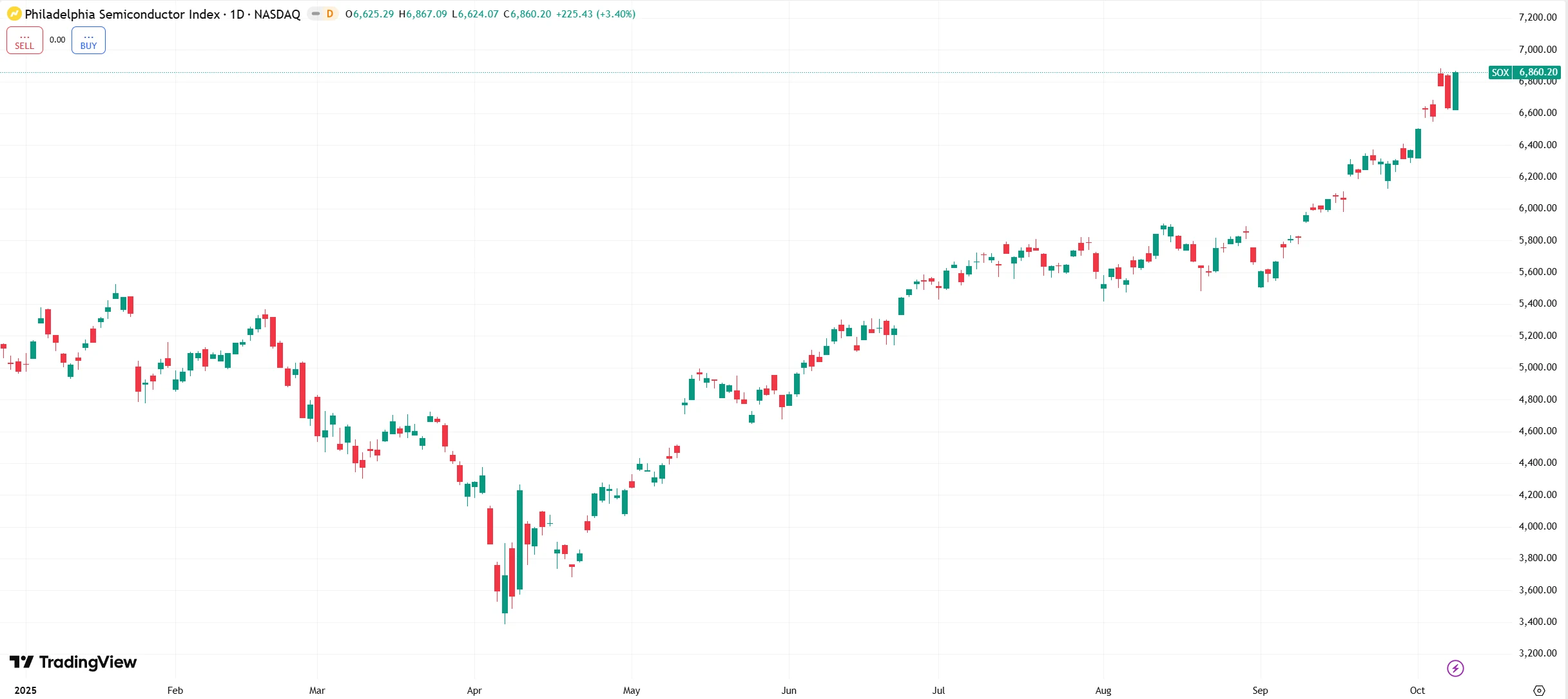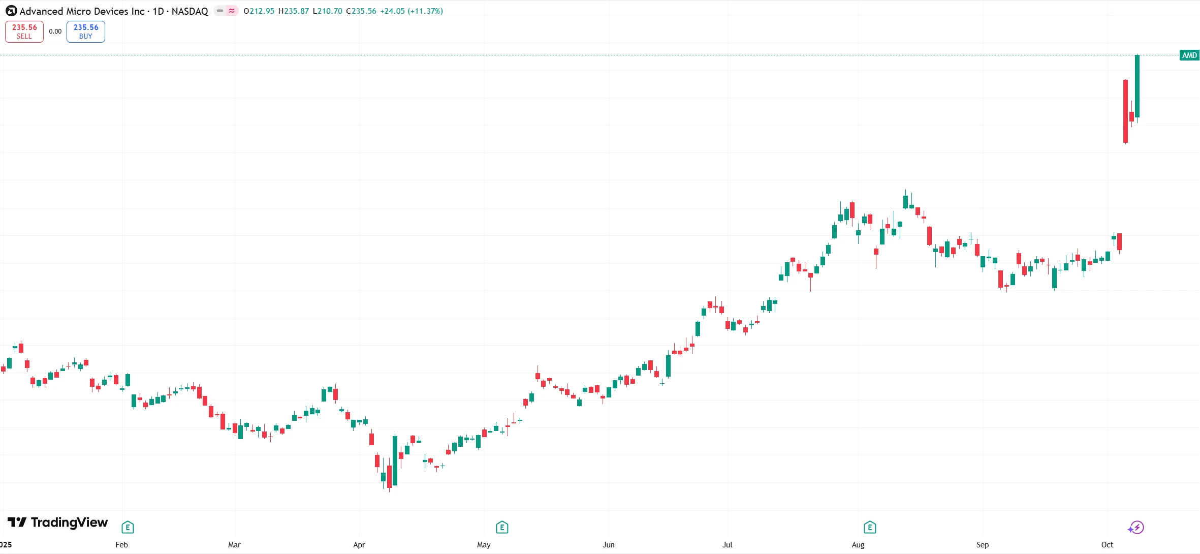 In October 2025, U.S. chip stocks staged a notable rally. Shares of Advanced Micro Devices (AMD) jumped 11.37% on October 8, bringing their three-day cumulative gain to 43.05% and marking a record high. Micron Technology rose more than 5%, while TSMC gained over 3%. In the previous two trading sessions, the Philadelphia Semiconductor Index had already advanced 4.3%.