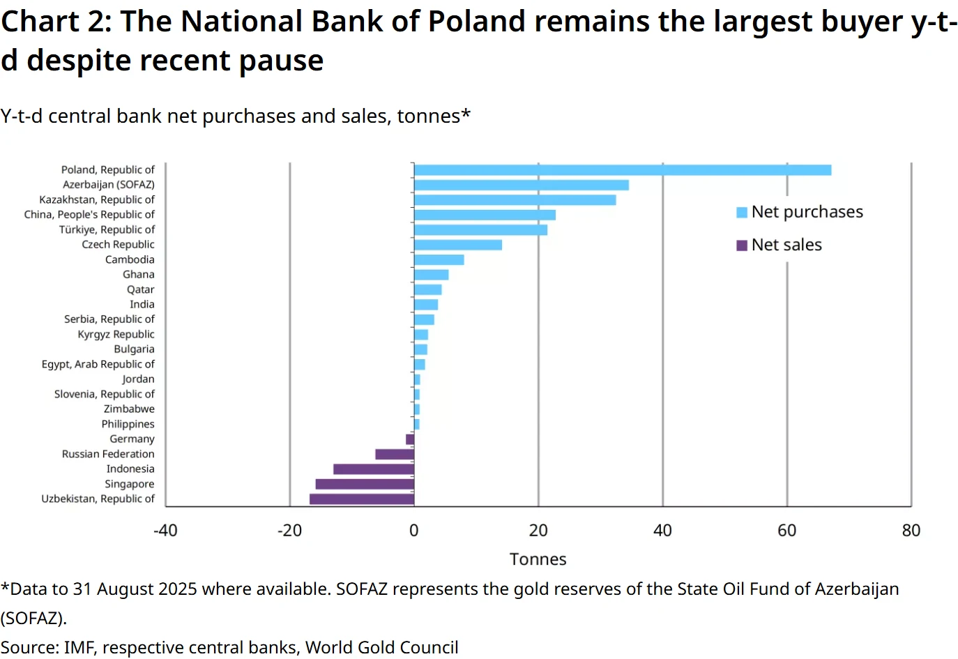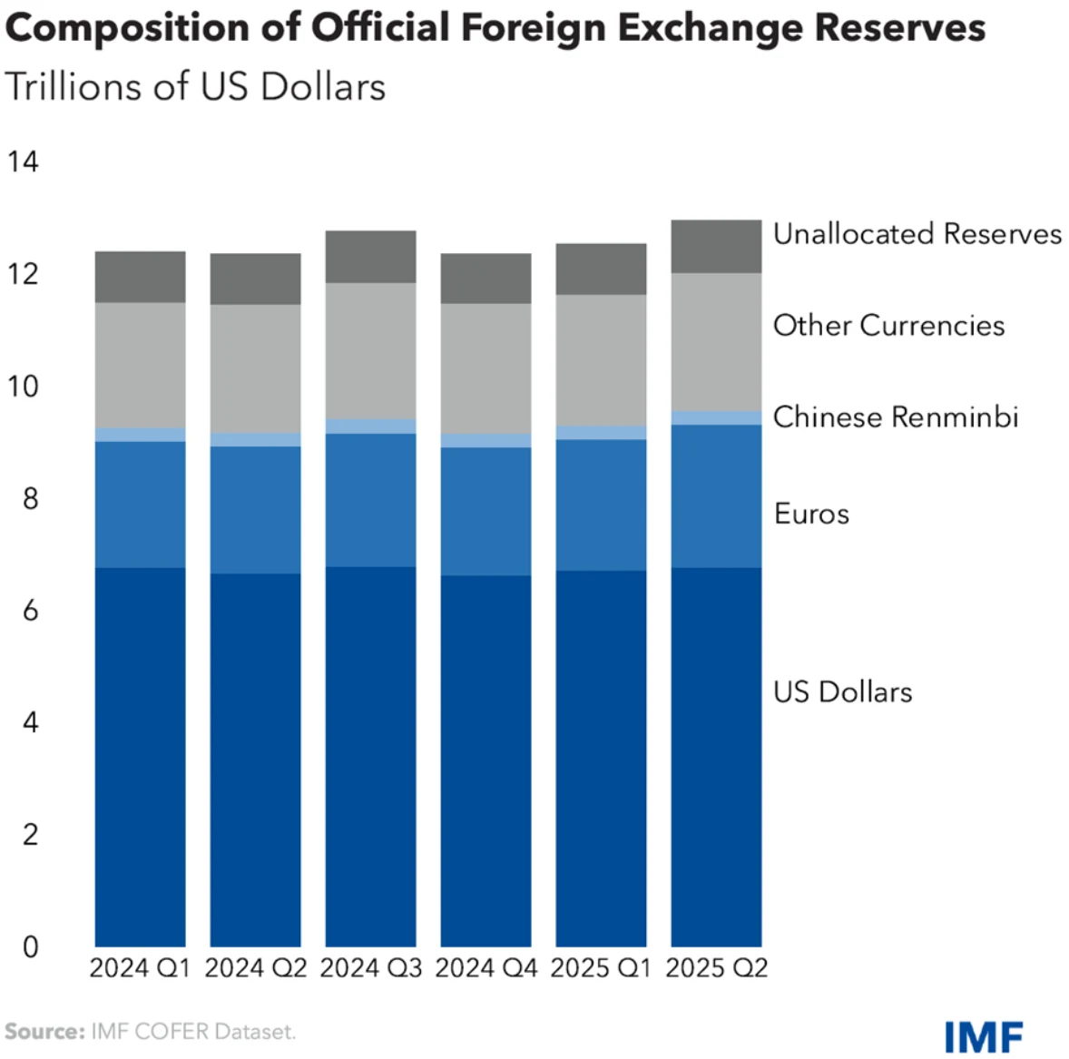 Changes in the composition of global foreign exchange reserves most clearly illustrate this trend. In Q2 2025, the dollar’s share of official global reserves fell to 56.3%—the lowest level since the IMF began tracking this data in 1995—down 10 percentage points from 66.3% in 2015. According to the IMF, 92% of this decline reflects the dollar’s depreciation relative to other currencies, while the remaining 8% reflects active asset sales, signaling central banks’ ongoing “de-dollarization” efforts.
