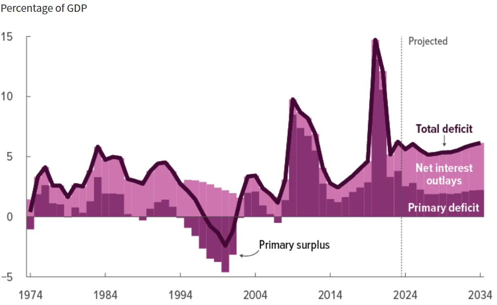 The CBO projects that between 2026 and 2030, U.S. real GDP growth will average just 1.7% annually, below the 2.3% average from 2010–2019. This implies that fiscal revenue growth may continue to lag behind spending expansion, with the deficit ratio remaining around 6% over the long term.