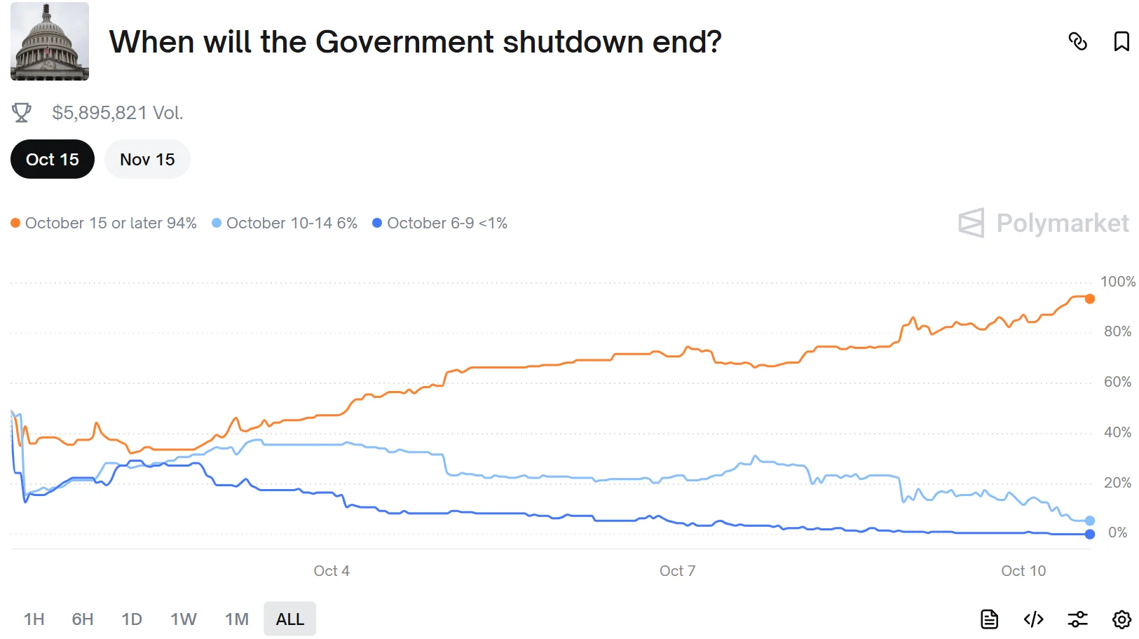 Although historical data show that roughly 80% of U.S. government shutdowns are resolved within two weeks, the negotiations this time are proving more challenging. In the short term, the two parties may still reach limited agreement on healthcare provisions, potentially advancing a continuing resolution to keep the government operating until November 21 and mitigate the impact of the shutdown on public sector operations. However, according to Polymarket’s forecast data, the probability of ending the shutdown before October 14 has fallen below 50%, indicating a marked decline in market expectations for a near-term resolution.