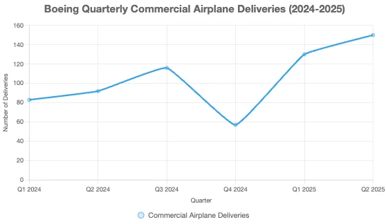 Boeing delivered 150 commercial airplanes in the second quarter of 2025, a 63% year-over-year increase. The increase in deliveries was driven by growth across several product types, including 104 737 narrow-body jets, 24 787 wide-body airplanes, and 22 767 and 777 series airplanes combined. Commercial Airplanes segment revenue increased 81% to $10.9 billion, with the division receiving 455 net orders, including significant new orders for the 787 and 777-9 from Qatar Airways and the 787-10 from British Airways.