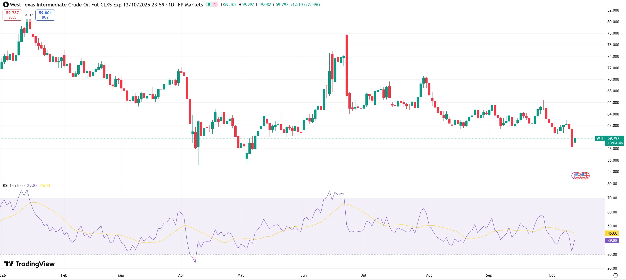 Technical indicators reveal that support remains weak: WTI has yet to decisively break above the $60 resistance level, while the RSI has only rebounded to around 45 — still within bearish territory. Key support lies in the $58.50–$59.30 range.