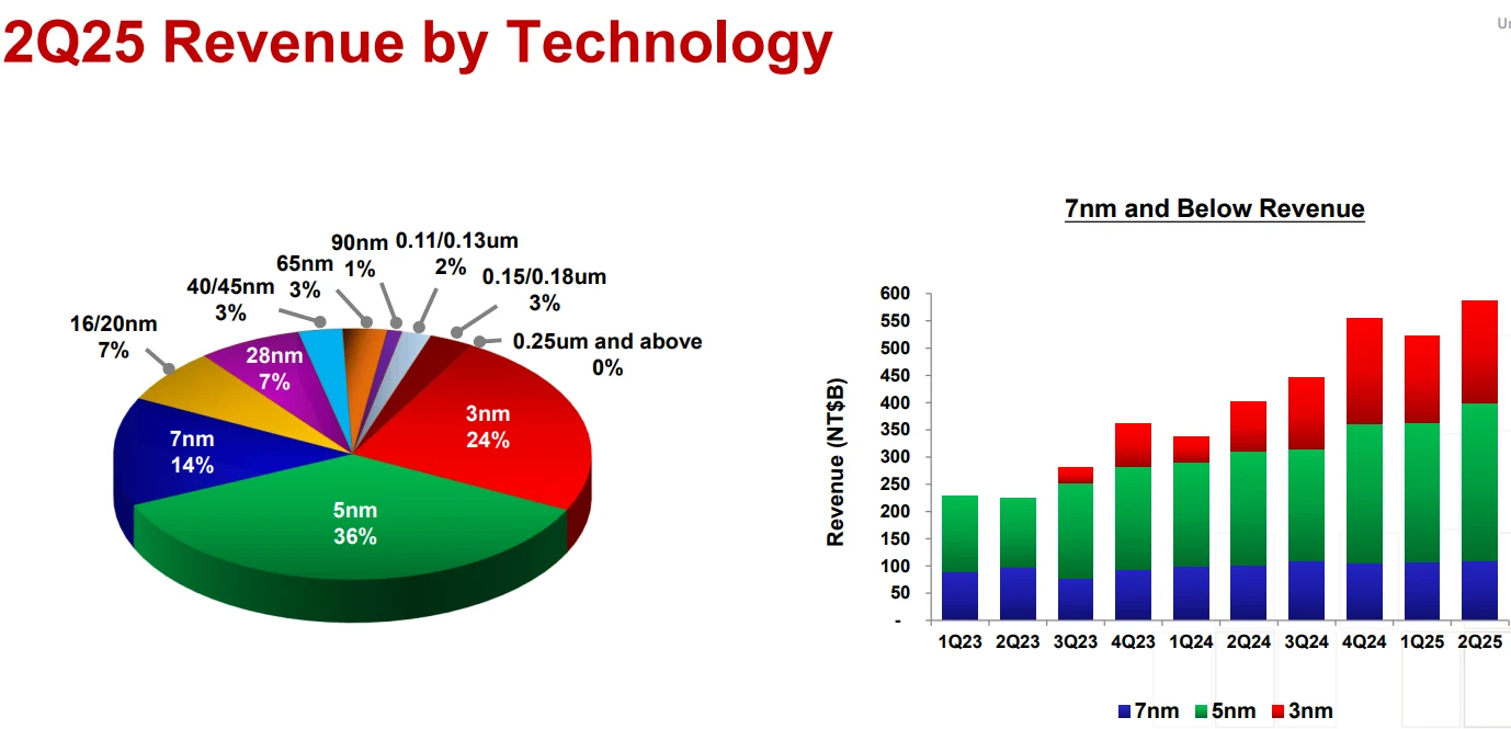 In Q2 2025, advanced process technologies of 7nm and below accounted for 74% of TSMC’s revenue, with 5nm contributing 36% and 3nm contributing 24%. Industry estimates suggest the 3nm share will further increase to 26–28% in Q3, with most of the incremental capacity dedicated to NVIDIA’s Blackwell GPU orders. From a technology cycle perspective, the expansion of TSMC’s advanced nodes is directly aligned with the rising demand for NVIDIA’s high-end AI chips.