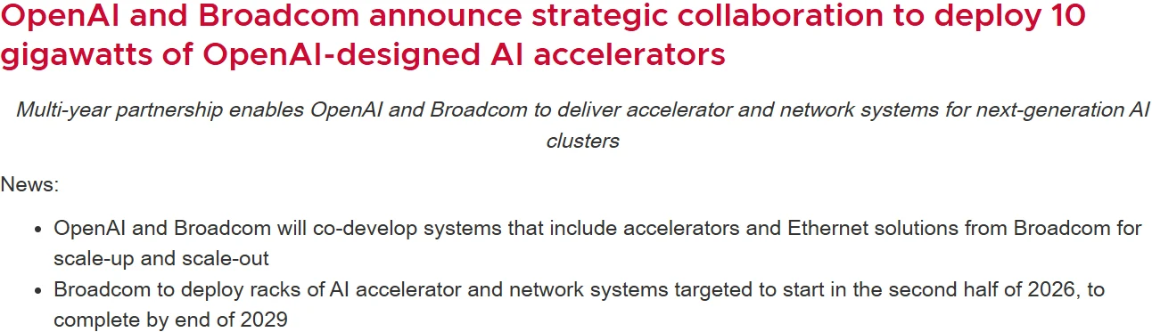 On October 13, 2025, local time, Broadcom and OpenAI jointly announced a strategic partnership to co-develop a 10GW custom AI accelerator. The announcement drove Broadcom’s stock up 9.88% on the day, lifting its market capitalization to $1.68 trillion, an intraday increase of over $150 billion.