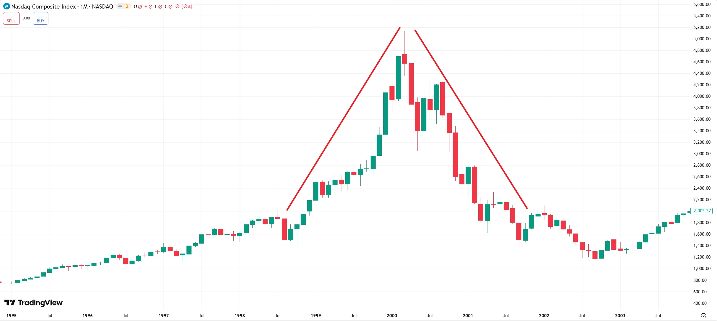 At the turn of the century, investors poured capital into emerging internet companies, believing that the internet would transform every business model. This led to valuations for companies without proven revenue or profitability that were far out of line with fundamentals. Between 1995 and 2000, the Nasdaq Technology Index surged nearly fivefold, while the combined market capitalization of internet companies reached roughly $4.5 trillion, despite total revenues of only $21 billion and cumulative losses of $62 billion—a stark disconnect between profitability and valuation.